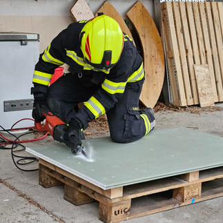 Im Anschluss an den theoretischen Teil der Schulung wurde der praktische Umgang, unter Anwendung der Sicherheitsbestimmungen der Geräte geübt. So gab es je eine Palette mit einer Holz Vertäfelung, eine mit Gipskarton Aufbau, eine mit Holzunterbau und Dachpappe, sowie eine Palette mit Trapezblechverkleidung als Simulation für Dach- und Wandkonstruktionen zu Zerschneiden, um wie bei Bränden nach Glutnestern suchen zu können.