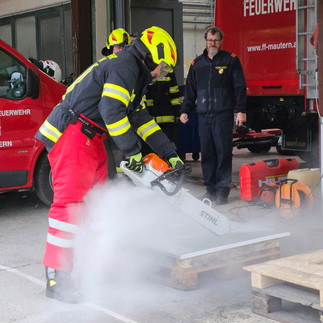 Zuerst mussten die Übungsteilnehmer gemeinsam mit unserem Zeugmeister, HBM Michael Brauneis, in einer PowerPoint Präsentation evaluieren, welche Schneid- und Trennwerkzeuge in der Feuerwehr Mautern vorhanden sind. Dabei wurden, angefangen vom Messer, dem Gurtschneider, dem Winkelschleifer, der Motorsäge, über die Säbelsäge bis hin zu unserer neuen Motorrettungssäge, alle Anwendungsgebiete sowie die Vor- und Nachteile der Geräte erarbeitet und welche persönliche Schutzausrüstung bei Anwendung der Geräte erforderlich ist.